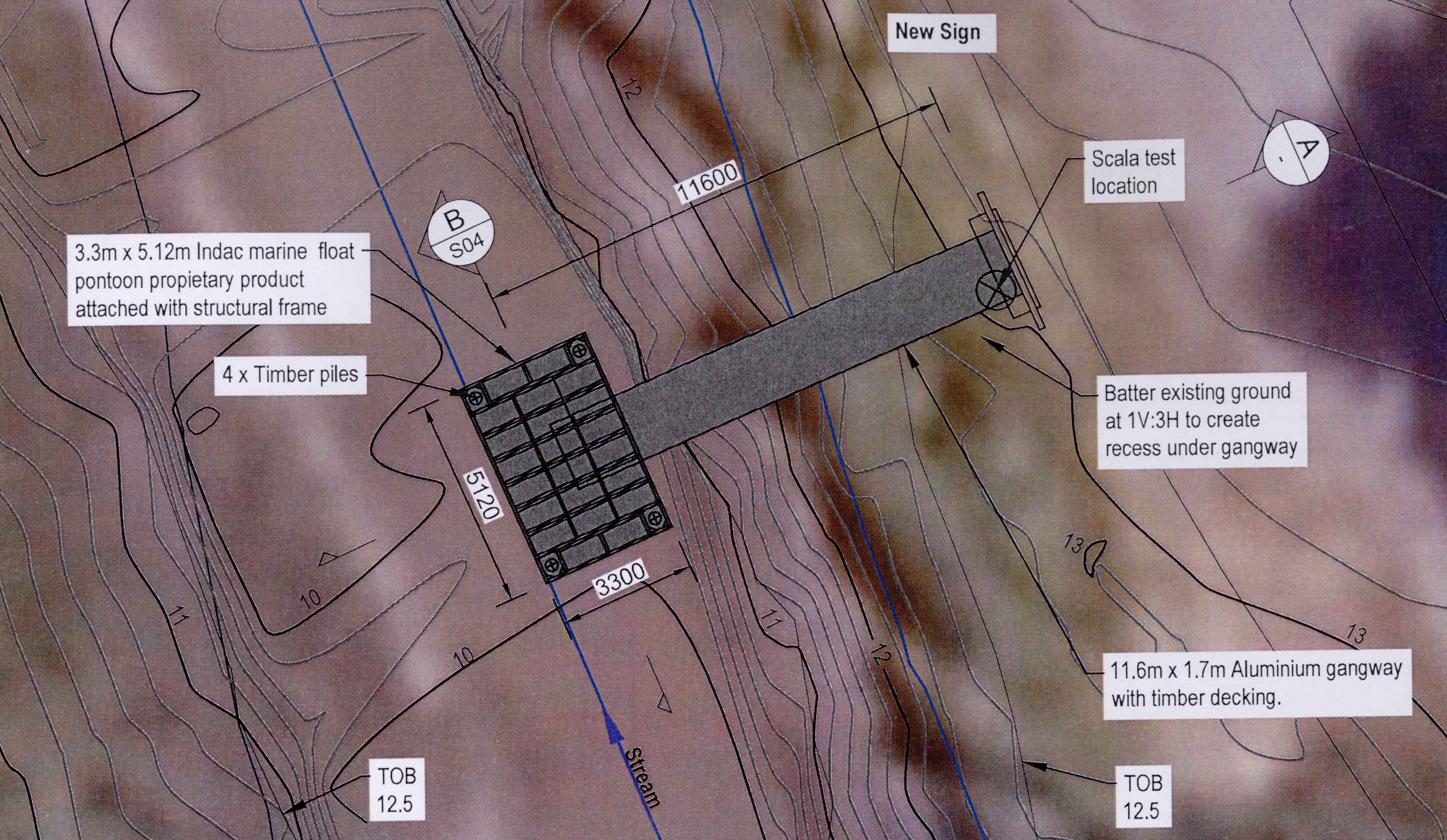 The tidal nature of the creek estuary, plus the history of high (and fast flowing) floods, combine to set requirements for this pontoon.